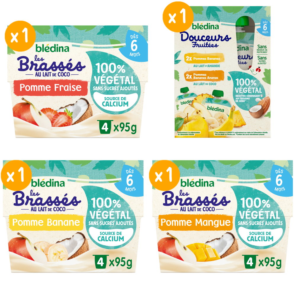 Découvrez les Gourdes Douceurs Fruitées et Les Brassés 100% Végétal : des brassés et des purées de fruits 100% végétal adaptés à bébé dès 6 mois. Initiez bébé aux saveurs végétales grâce à l’association du lait de coco ou du lait d’amande à de savoureuses purées de fruits dans le lot Multivariétés Gourdes Douceurs Fruitées et Brassés 100% Végétal !   Un format pratique en gourde à emporter partout Une nouvelle texture de brassé pour bébé, plus onctueuse Sans protéines d’origine animale Convient également aux enfants allergiques aux protéines de lait de vache   Lot multi-variété de 4 packs contenant : 1 pack Gourdes Douceurs Fruitées Pommes Bananes Lait d’amande et Pommes Bananes Ananas Lait de coco 1 pack Brassés 100% Végétal au Lait de Coco, Pomme et Mangue - 4x95g 1 pack  Brassés 100% Végétal au Lait de Coco, Pomme et Banane - 4x95g 1 pack  Brassés 100% Végétal au Lait de Coco, Pomme et Fraise- 4x95g