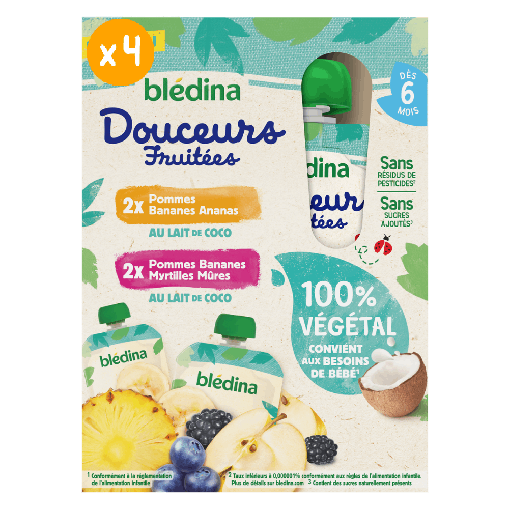 Découvrez les Gourdes Fruitées 100% Végétal : des purées de fruits végétales Blédina adaptées à bébé dès 6 mois. Initiez bébé aux saveurs 100% végétal grâce à l’association du lait de coco et de savoureuses purées de fruits avec les Gourdes Fruitées 100% Végétal !   Format pratique en gourde à emporter partout Sans protéines d’origine animale Convient également aux enfants allergiques aux protéines de lait de vache   Ce lot contient 4 packs de 4 gourdes de 90g chacune. 8x Pommes Bananes Ananas au Lait de Coco 8x Pommes Bananes Myrtilles Mûres