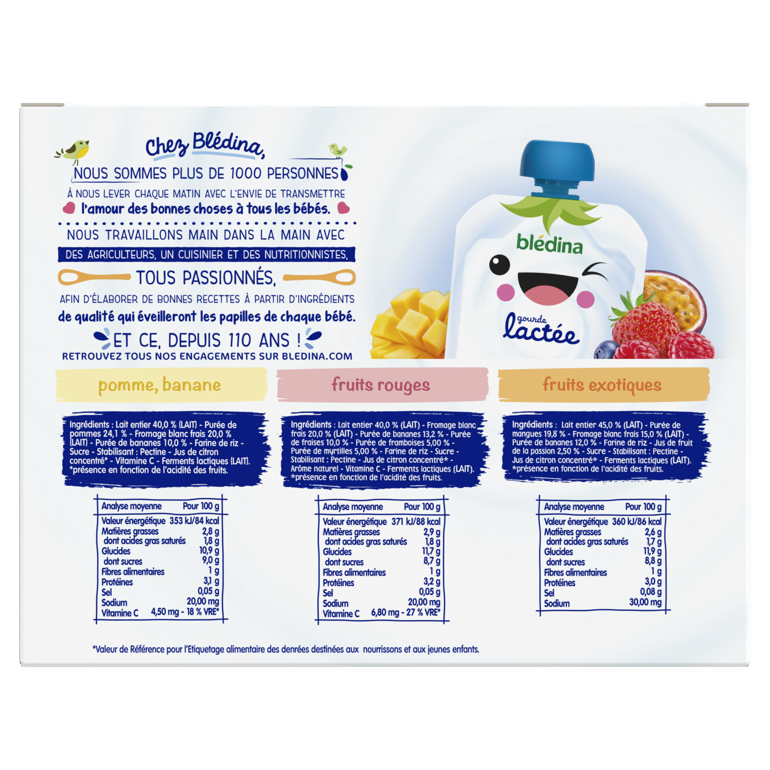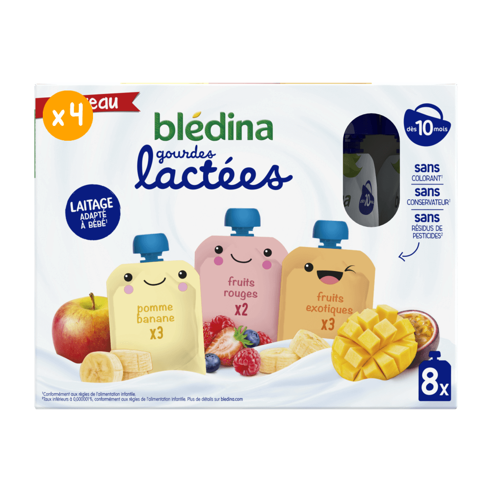 Faites découvrir à votre bébé notre assortiment de gourdes lactées aux fruits !   Des saveurs variées pour accompagner bébé dans la grande aventure de la diversification alimentaire, que ce soit à la maison ou à l'extérieur grâce à leur format ultra pratique !    Les gourdes Blédina sont sans sucres ajoutés*, sans résidus de pesticides**, et sans colorant***, dès 10 mois.   Ce lot contient 32 gourdes de 85g chacune :  12 gourdes Pomme Banane 8 gourdes Fruits rouges 12 gourdes Fruits exotiques   *Contient des sucres naturellement présents **Taux inférieurs à 0,000001% conformément aux règles de l’alimentation infantile ***Conformément à la règlementation de l’alimentation infantile​ ​  ​