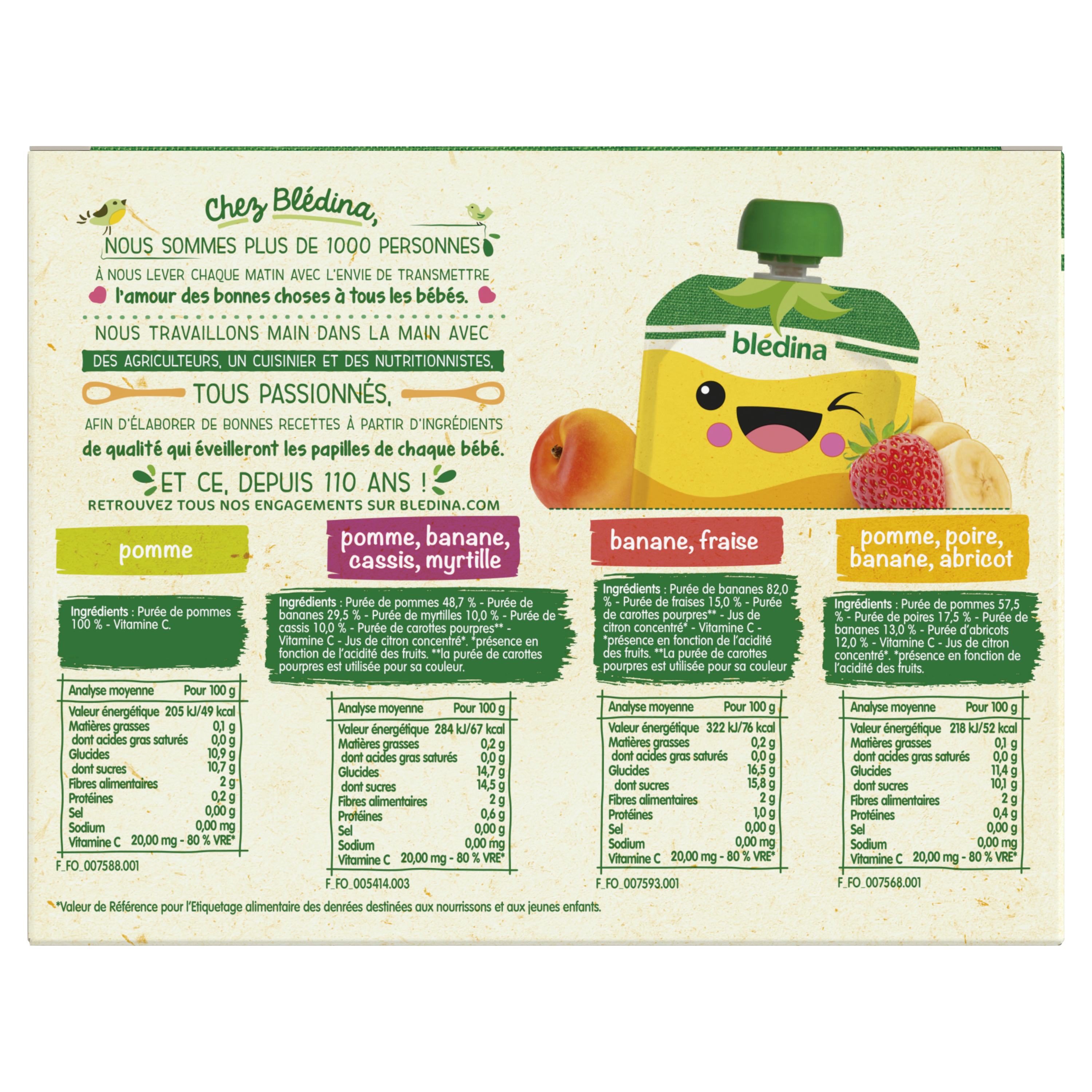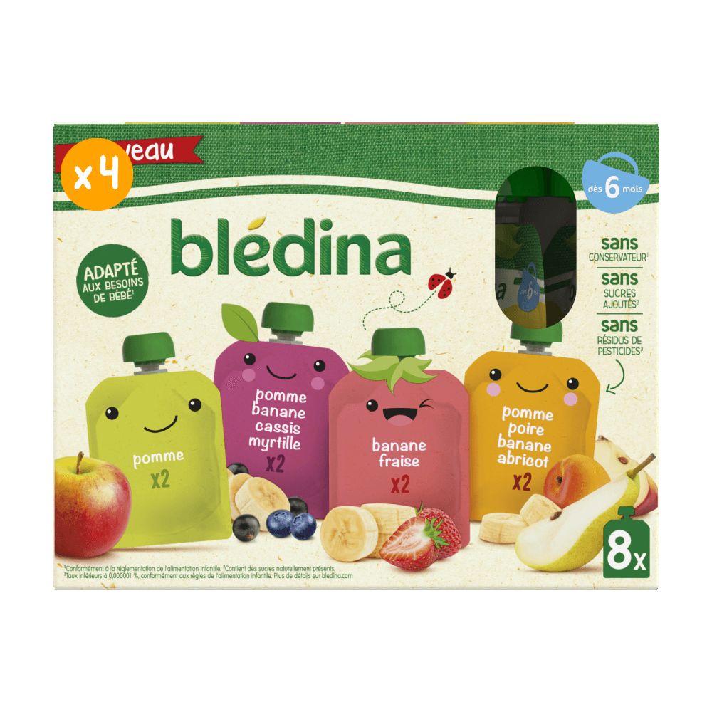 Blédina vous propose un assortiment de délicieuses purées de fruits pour faire découvrir de nouvelles saveurs à bébé. Et dans un format gourde pratique à emporter ! Nos gourdes sont garanties sans sucres ajoutés(1) et sans résidus de pesticides(2). Ce lot contient 32 gourdes de 90g chacune de: 8x Pommes 8x Pommes Bananes Cassis Myrtilles 8x Bananes Fraises 8x Pommes Poires Bananes Abricots (1)contient les sucres naturels des fruits (2)taux inférieurs à 0,000001%, conformément aux règles de l’alimentation infantile
