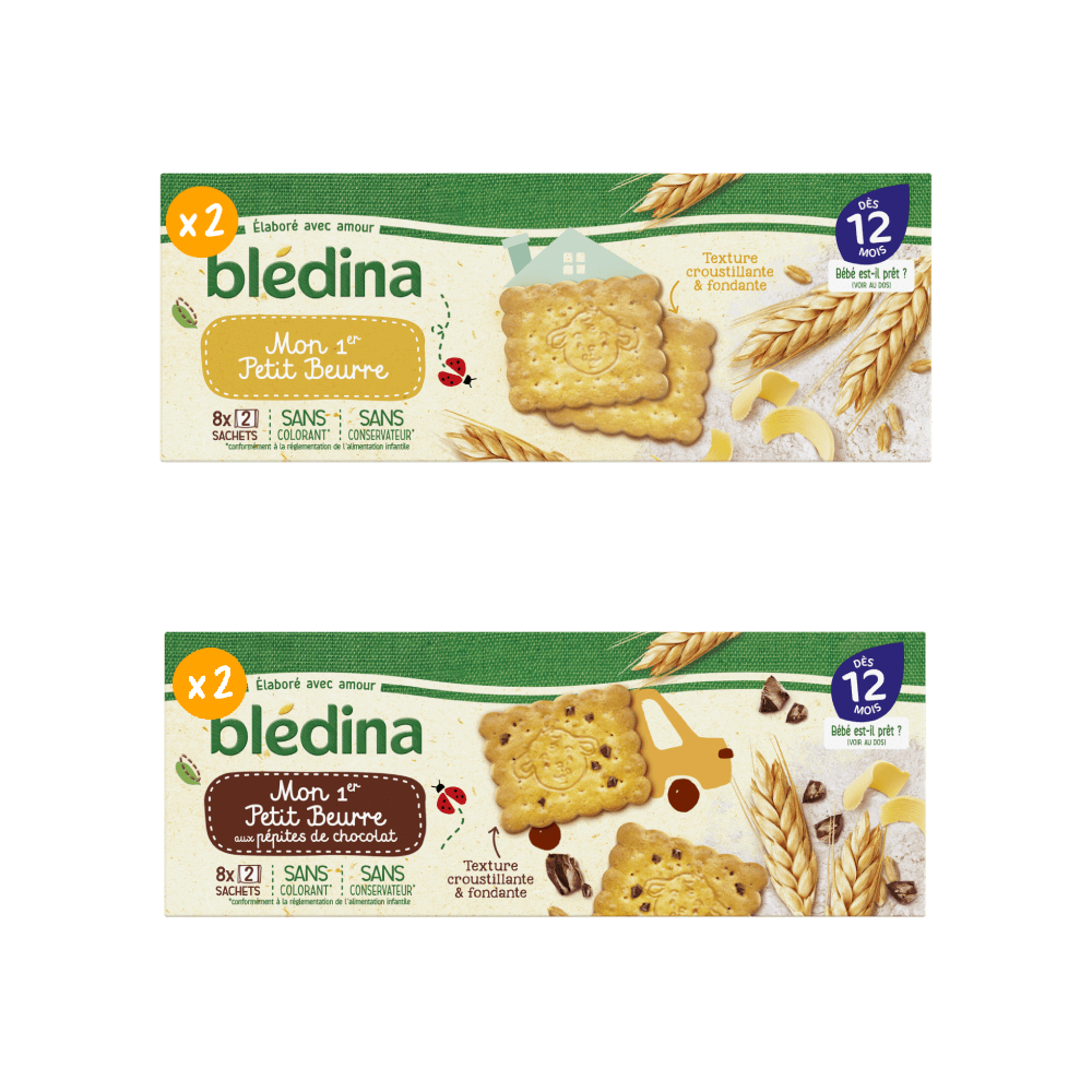 Découvrez des biscuits spécialement conçus pour Bébé dès 12 mois (se référer ci-dessous aux détails des informations du produit pour savoir si bébé est prêt), pour un petit-déjeuner ou un goûter gourmand et adapté.   Texture croquante puis fondante en bouche Forme idéale pour ses petites mains Format pratique : 8 sachets de 2 biscuits pour les emporter partout   Ce lot contient 4 packs de 8 sachets :  2x Biscuit - Mon 1er Petit Beurre (133g) 2x Biscuit - Mon 1er Petit Beurre Pépites de Chocolat (133g)