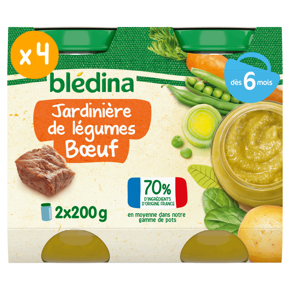 Découvrez les Petits pots Blédina, de délicieuses recettes pour faire découvrir à bébé de nouveaux légumes. Blédina s'engage aussi pour l'avenir de l'agriculture française : 70% de nos ingrédients sont d'origine France**. Lot de 4 packs contenant chacun 2x200g de purée. **En moyenne dans notre gamme de pots
