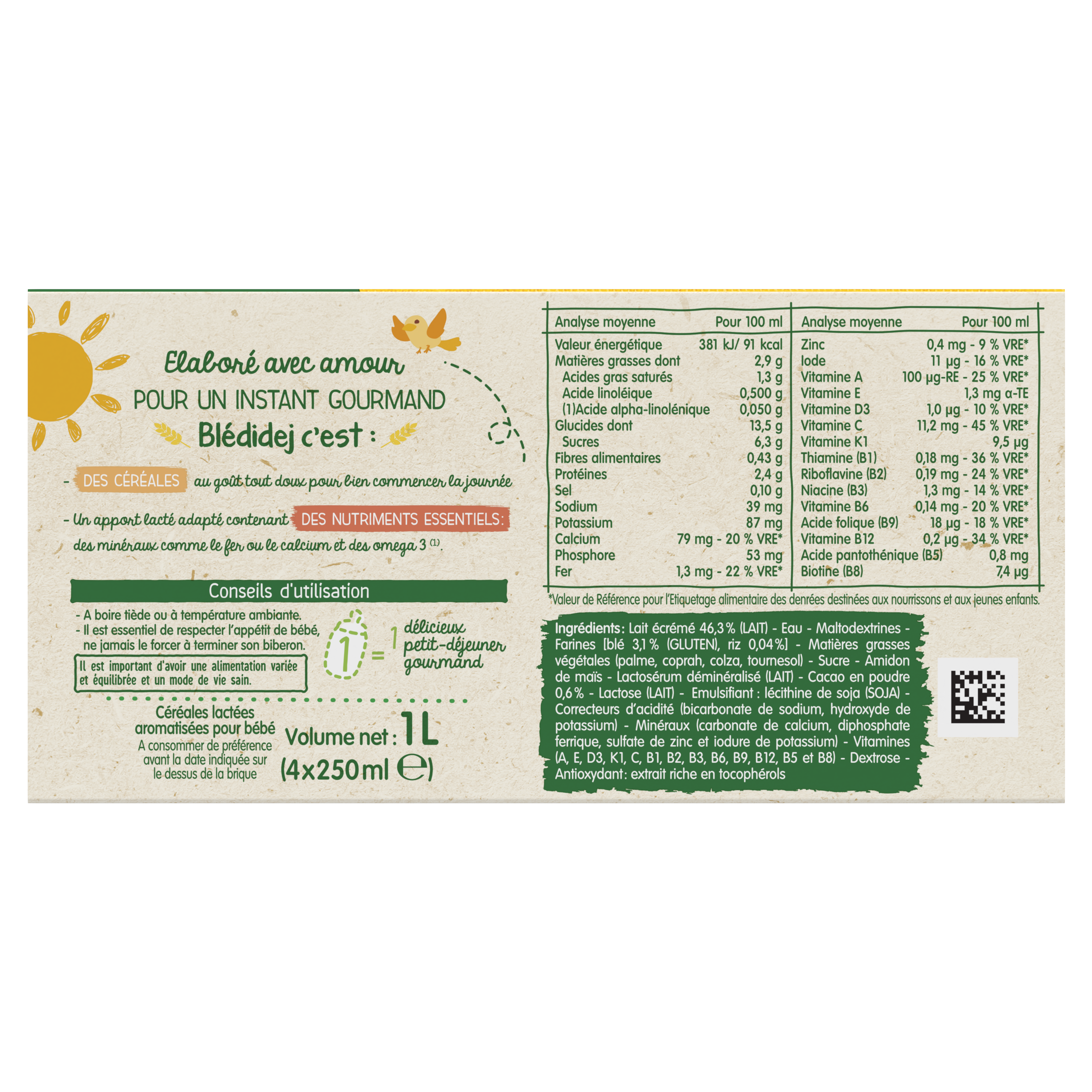 Blédidej, ce sont de délicieuses céréales lactées au goût tout doux et à la texture onctueuse pour bien commencer la journée ! Découvrez Blédidej Cacao pour un petit-déjeuner complet et équilibré à la saveur gourmande du cacao dès 6 mois.   Un format brique pratique à emmener partout 1 brique = 1 biberon  Lot de 3 packs contenant chacun 4 briques de 250mL.