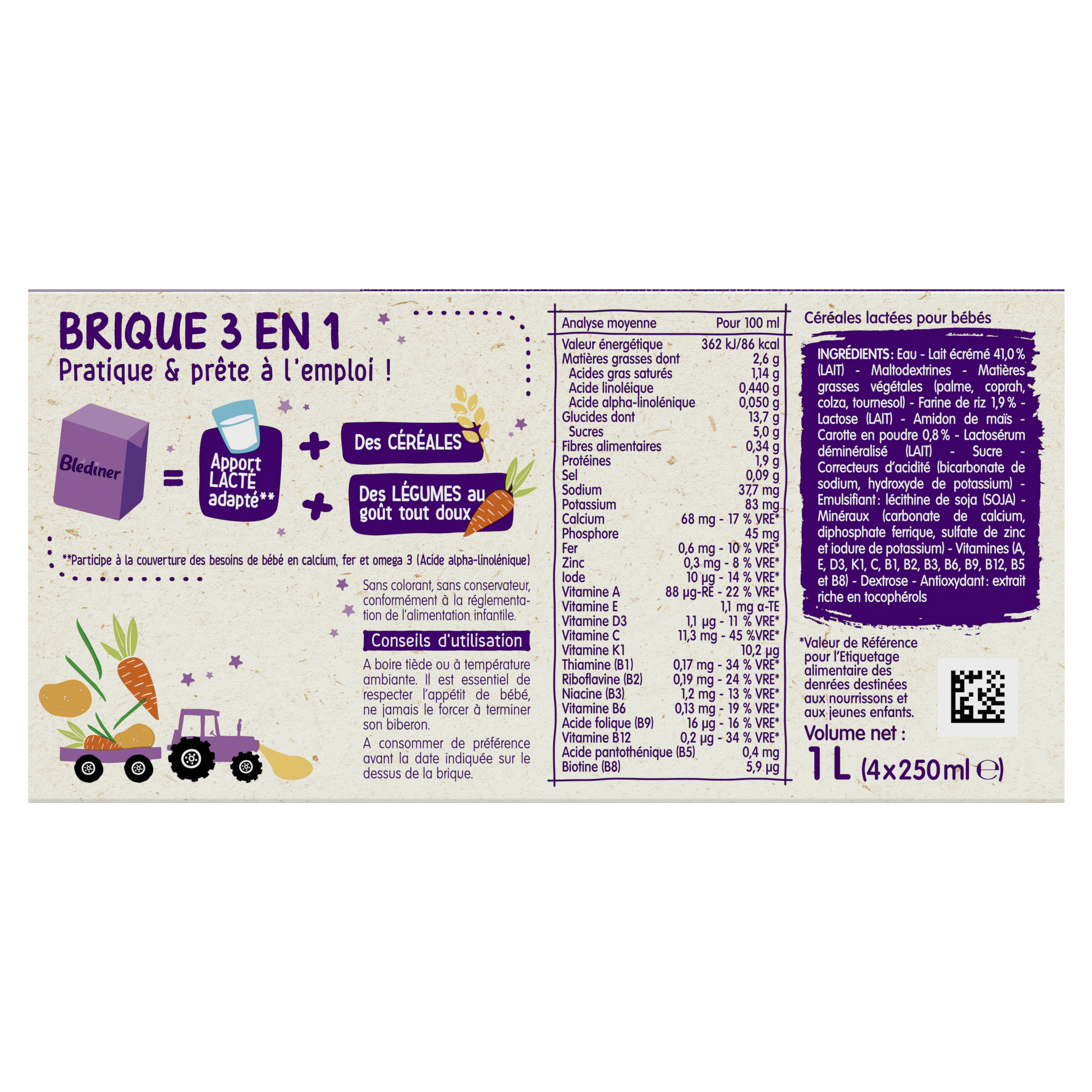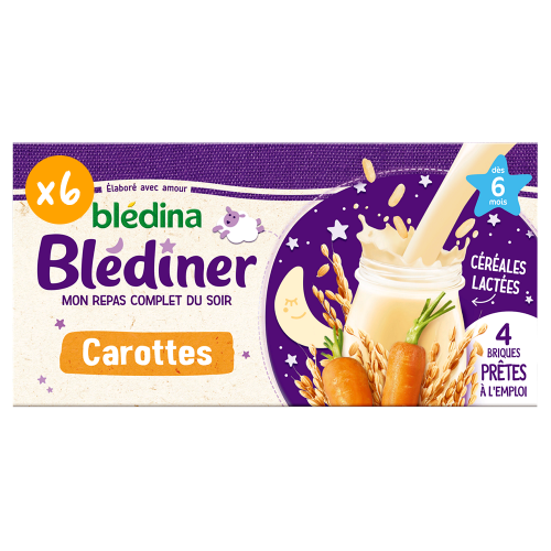 Blédîner Carottes, c’est un savoureux diner complet pour bébé avec un apport lacté adapté2, des céréales et des légumes au goût tout doux ! Et le tout dans un format pratique & prêt à l’usage !
