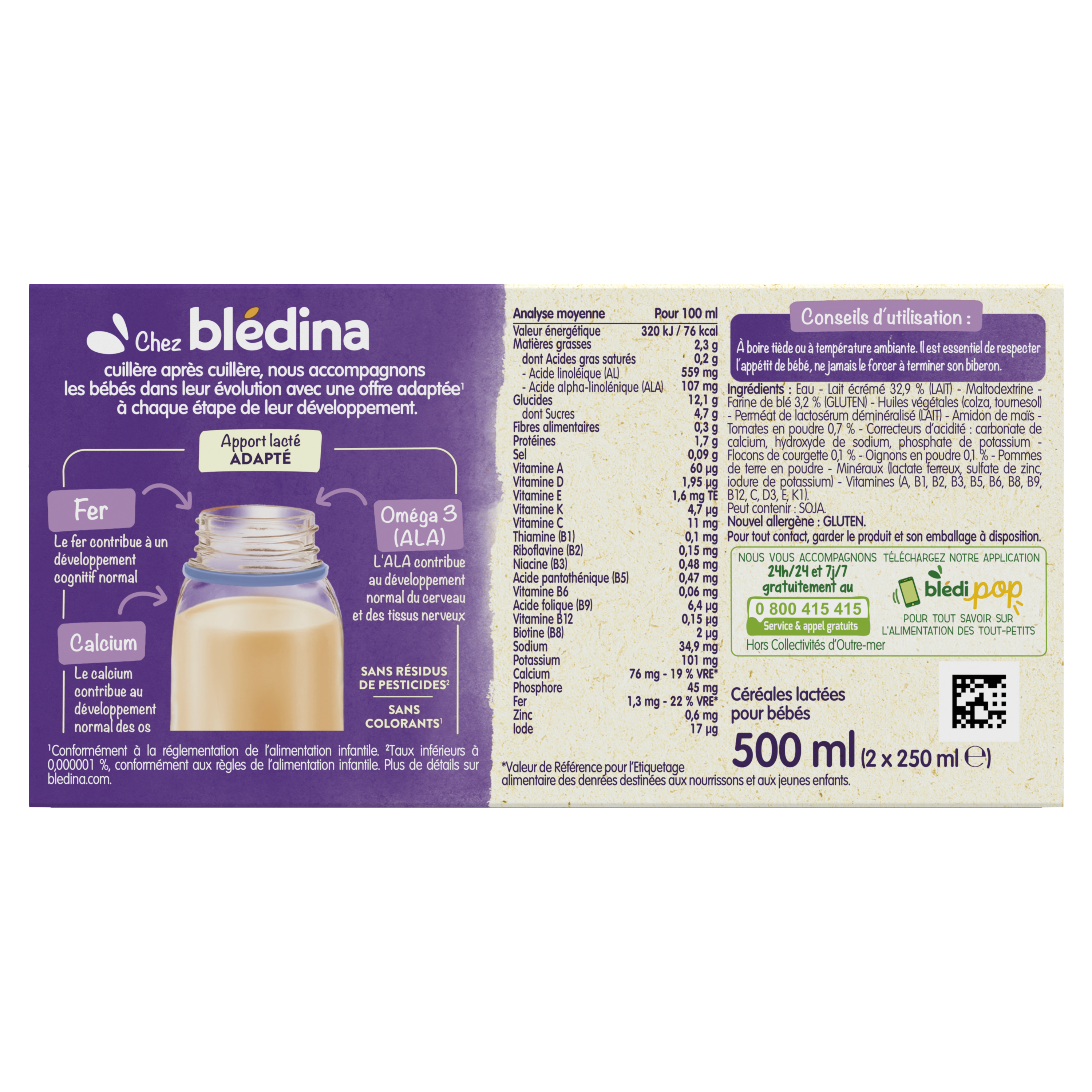 Nouvelle recette : Blédîner Céréales lactées Légumes du Soleil, c'est un savoureux plat complet du soir pour bébé avec un apport lacté adapté*, des céréales et des légumes au goût tout doux ! Et le tout dans un format pratique & prêt à l'usage ! Ce lot contient 12 briques de 250 ml chacune *Participe à la couverture des besoins de bébé en calcium, fer et omega 3 (DHA & Acide alpha-linolénique).