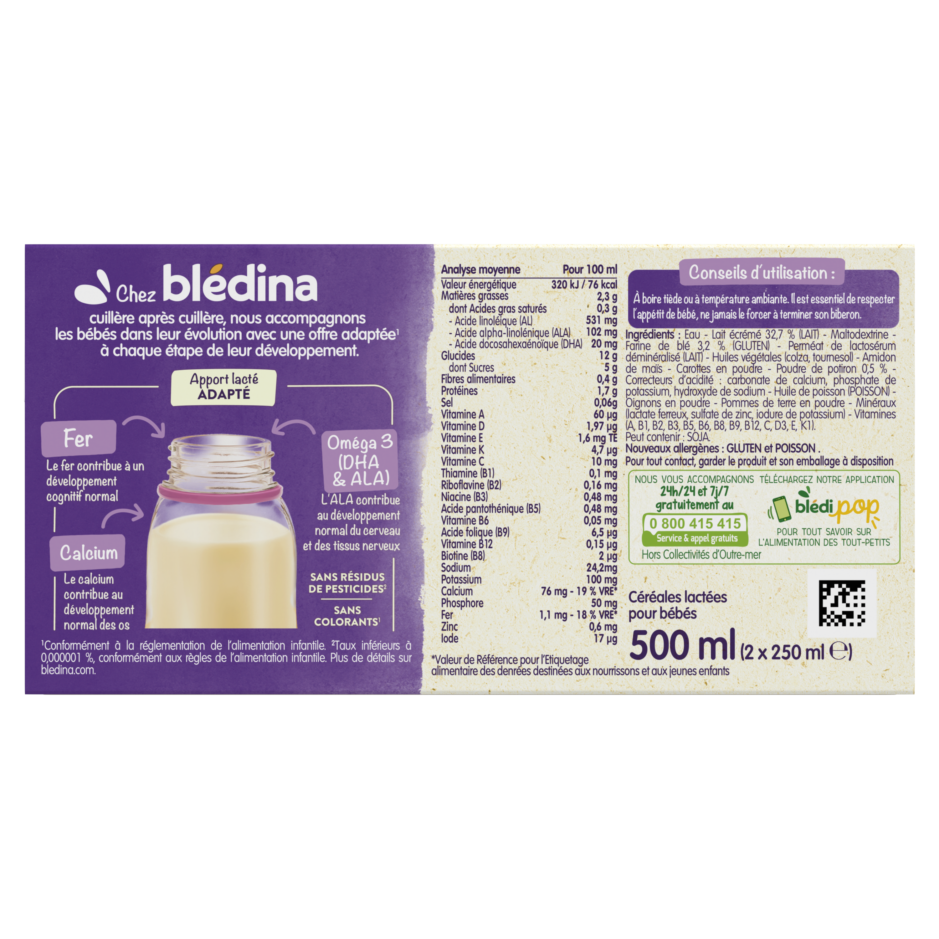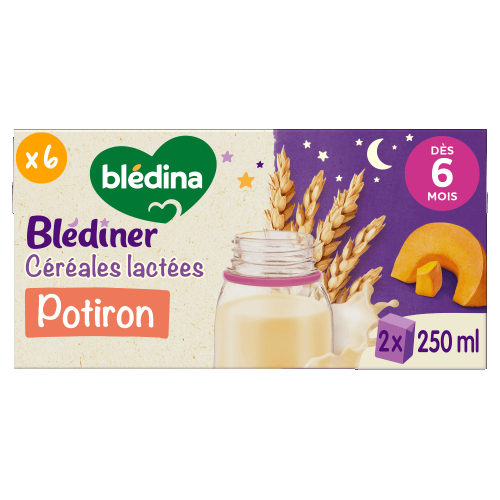 Nouvelle recette : Blédîner Potiron,  c’est un savoureux dîner complet pour bébé avec un apport lacté adapté, des céréales et des légumes au goût tout doux ! Et le tout dans un format pratique & prêt à l’usage ! La recette Blédîner Brique Potiron évolue légèrement, retrouvez toutes les informations à jour (ingrédients et valeurs nutritionnelles) ci-dessous. Ce lot contient 12 briques de 250mL chacune.