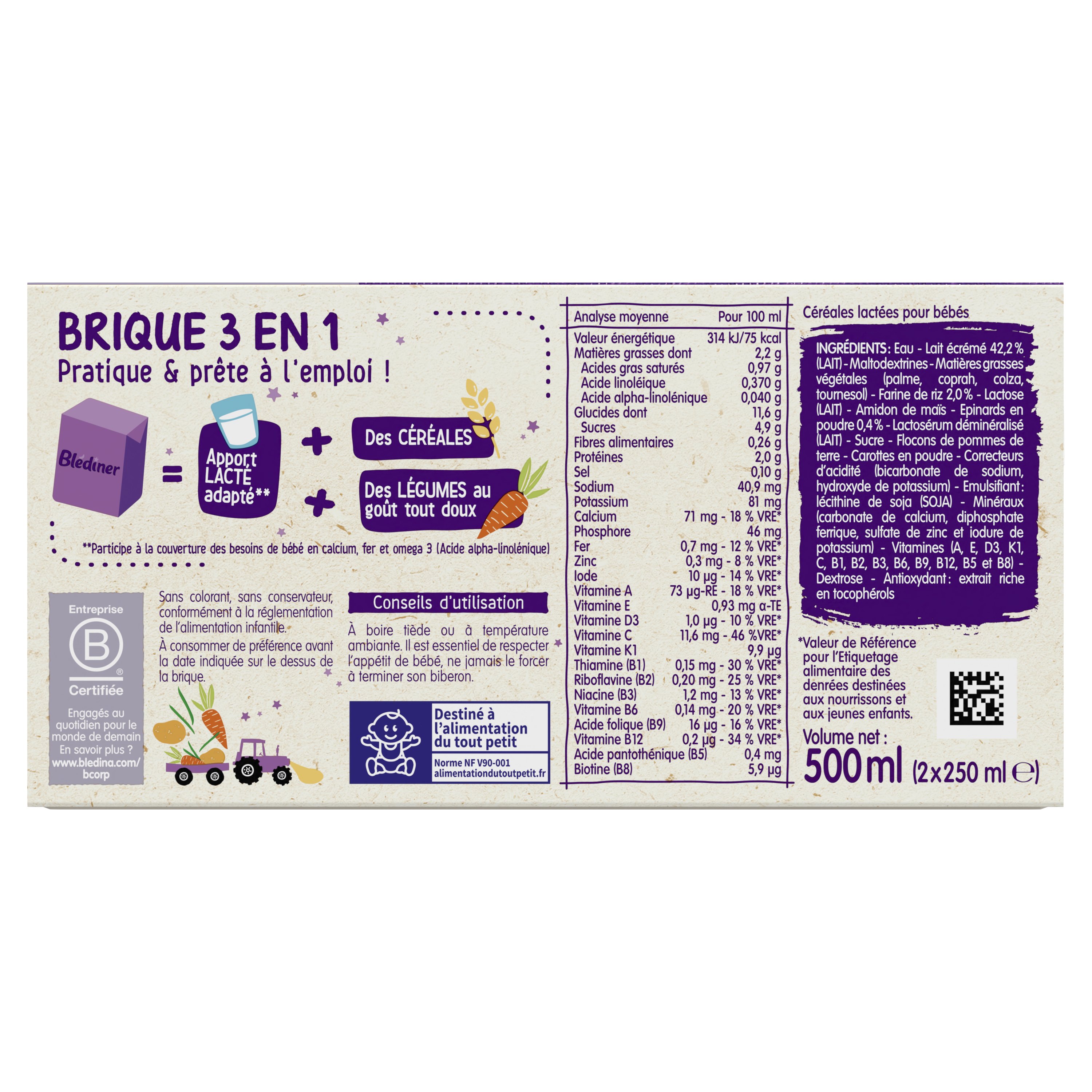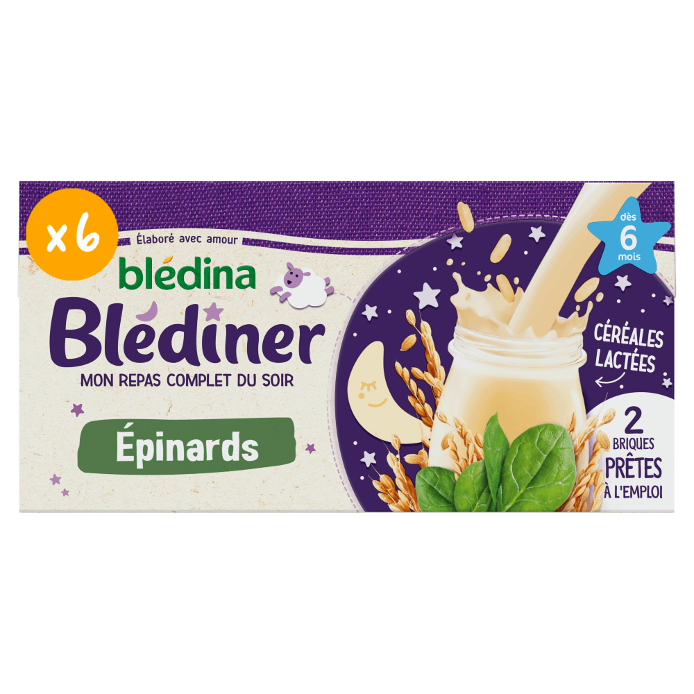 Blédîner Epinards, c’est un savoureux dîner complet pour bébé avec un apport lacté adapté, des céréales et des légumes au goût tout doux ! Et le tout dans un format pratique & prêt à l’usage ! Ce lot contient 12 briques de 250 mL chacune (6 packs de 2 briques chacun).