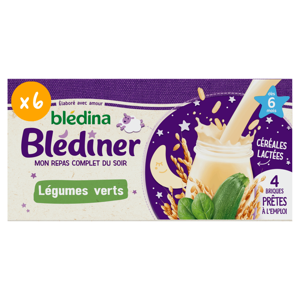 Blédîner Légumes Verts, c’est un savoureux diner complet pour bébé avec un apport lacté adapté2, des céréales et des légumes au goût tout doux ! Et le tout dans un format pratique & prêt à l’usage !