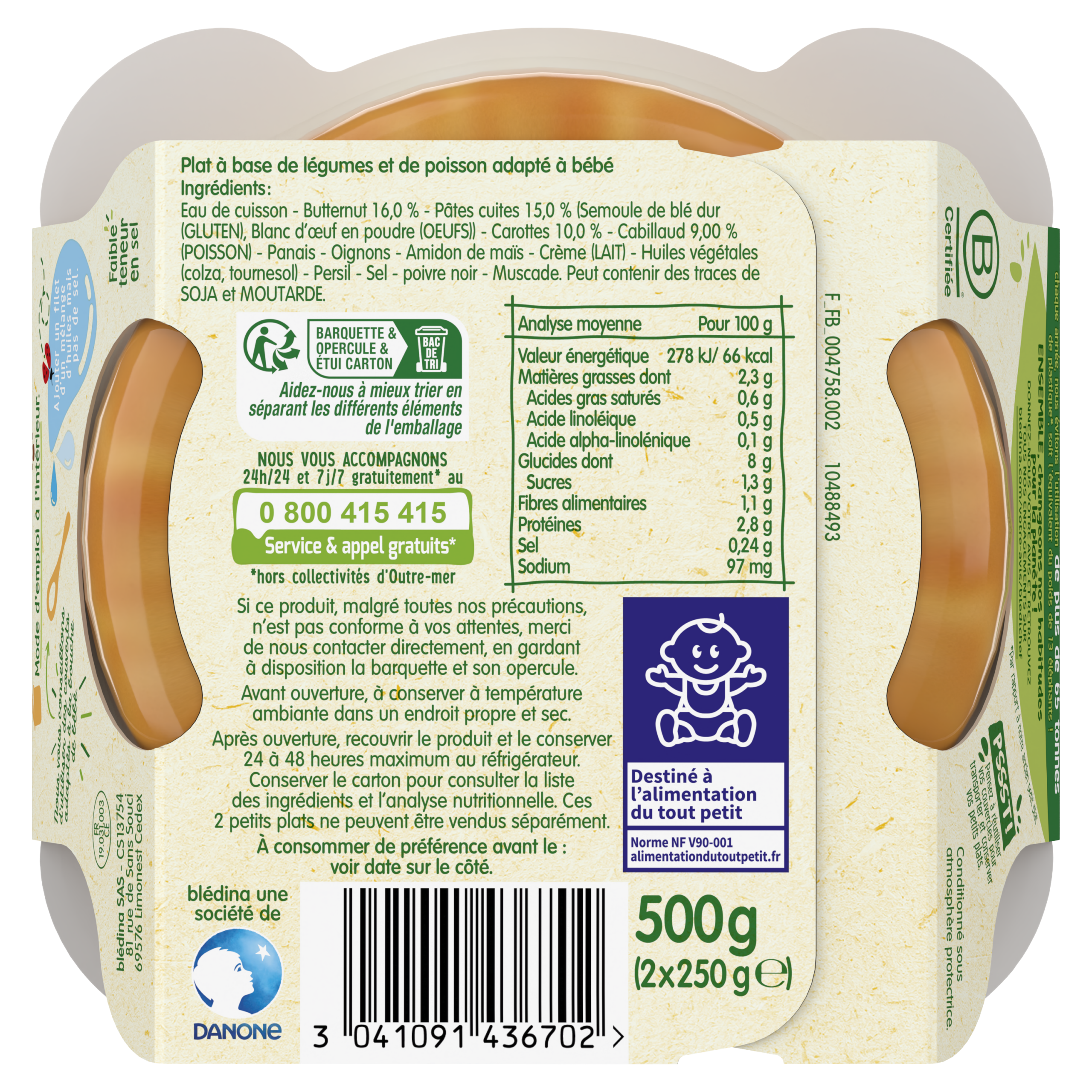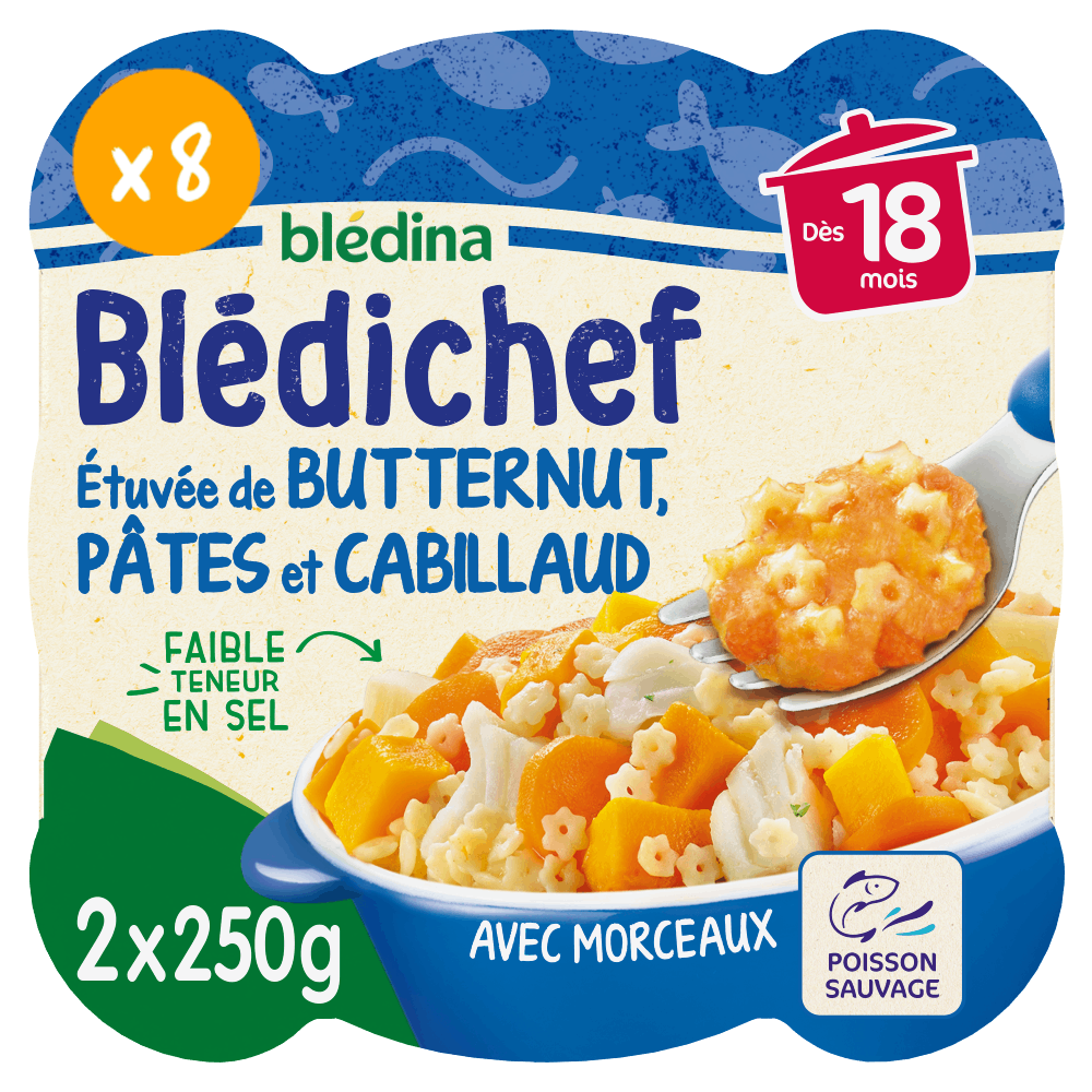 Découvrez les petits plats Blédichef® de Blédina : une large gamme de plats savoureux pour le déjeuner et le dîner, spécialement élaborés pour régaler votre bébé en toute sérénité et lui faire découvrir chaque jour de nouvelles saveurs ! Ce petit plat Blédichef®, avec des morceaux, est adapté à bébé à partir de 18 mois. Des ingrédients d’origine naturelle Cuisiné avec du poisson sauvage, garanti pêche durable Un format toujours aussi pratique ⠀⠀⠀⠀⠀⠀⠀⠀ ⠀⠀⠀⠀⠀⠀⠀⠀⠀⠀ Découvrez nos Blédichef x2 –40% de plastique*. Sans couvercle mais pas sans raison *par rapport à nos anciens plats ⠀⠀⠀⠀⠀⠀⠀⠀⠀⠀⠀⠀⠀⠀⠀⠀ Lot de 8 plats de 250g.
