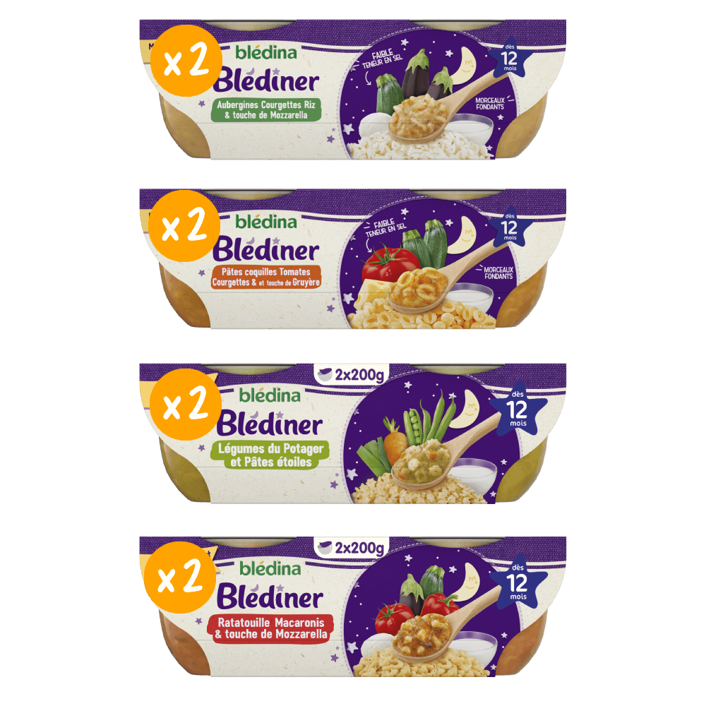 Retrouvez nos recettes préférées du soir de notre gamme bols Blédîner dès 12 mois, dans un nouveau format 16x200g. De savoureux petits plats à donner à la cuillère aux textures moulinées. Des recettes au bon goût de légumes et de féculents variés, avec une touche de lait pour la douceur, le tout dans des bols pratiques et faciles à transporter.   Nos bols Blédîner sont sans couvercle ! Et non sans raison, car cela permet à Blédina d’éviter l’utilisation de plus de 130 tonnes de plastique par an*. Cela représente une réduction de 35,6% de plastique sur chacun de nos bols !   *Sur la base des projections de vente des Bols Blédina 2x200g en 2024 (marché GMS français).   Ce lot contient 16 bols de 200g chacun: 2 packs Blédîner - Légumes du potager et Pâtes étoile  2 packs Blédiner - Ratatouille Macaronis et touche de Mozzarella 2 packs Blédîner - Pâtes coquilles Tomates Courgettes et touche de Gruyère  2 packs Blédîner  - Mouliné d'aubergines et courgettes, riz et touche de Mozzarella