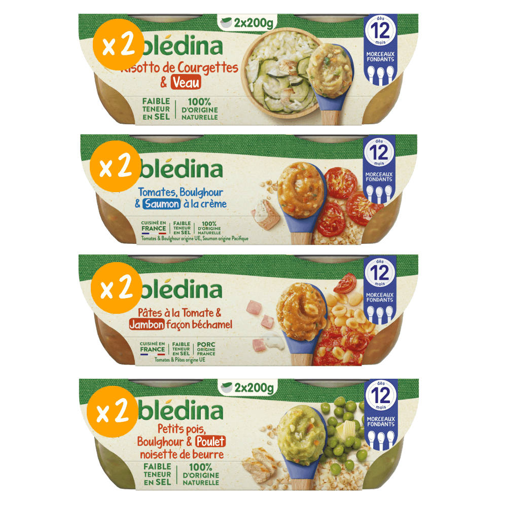 Retrouvez nos recettes préférées du midi de nos bols Déjeuner dès 12 mois, dans un nouveau format 16x200g. Des petits plats inspirés du fait maison, avec une des morceaux fondants, pour accompagner sereinement bébé sur le chemin des textures et des saveurs, Nous avons retravaillé notre gamme Mes Moulinés : désormais les bols Déjeuner offrent une texture progressive de 6 à 12 mois, et sont sans couvercle ! Et non sans raison, car cela permet à Blédina d’éviter l’utilisation de plus de 130 tonnes de plastique par an*. Cela représente une réduction de 35,6% de plastique sur chacun de nos bols ! *Sur la base des projections de vente des Bols Blédina 2x200g en 2024 (marché GMS français). Ce lot contient 16 bols de 200g chacun: 2 packs Bol Déjeuner - Petits pois Boulghour Poulet noisette de beurre 2 packs Bol Déjeuner - Pâtes à la tomate et Jambon façon béchamel 2 packs Bol Déjeuner - Risotto de Courgettes et Veau 2 packs Bol Déjeuner - Tomates Boulghour et Saumon à la crème