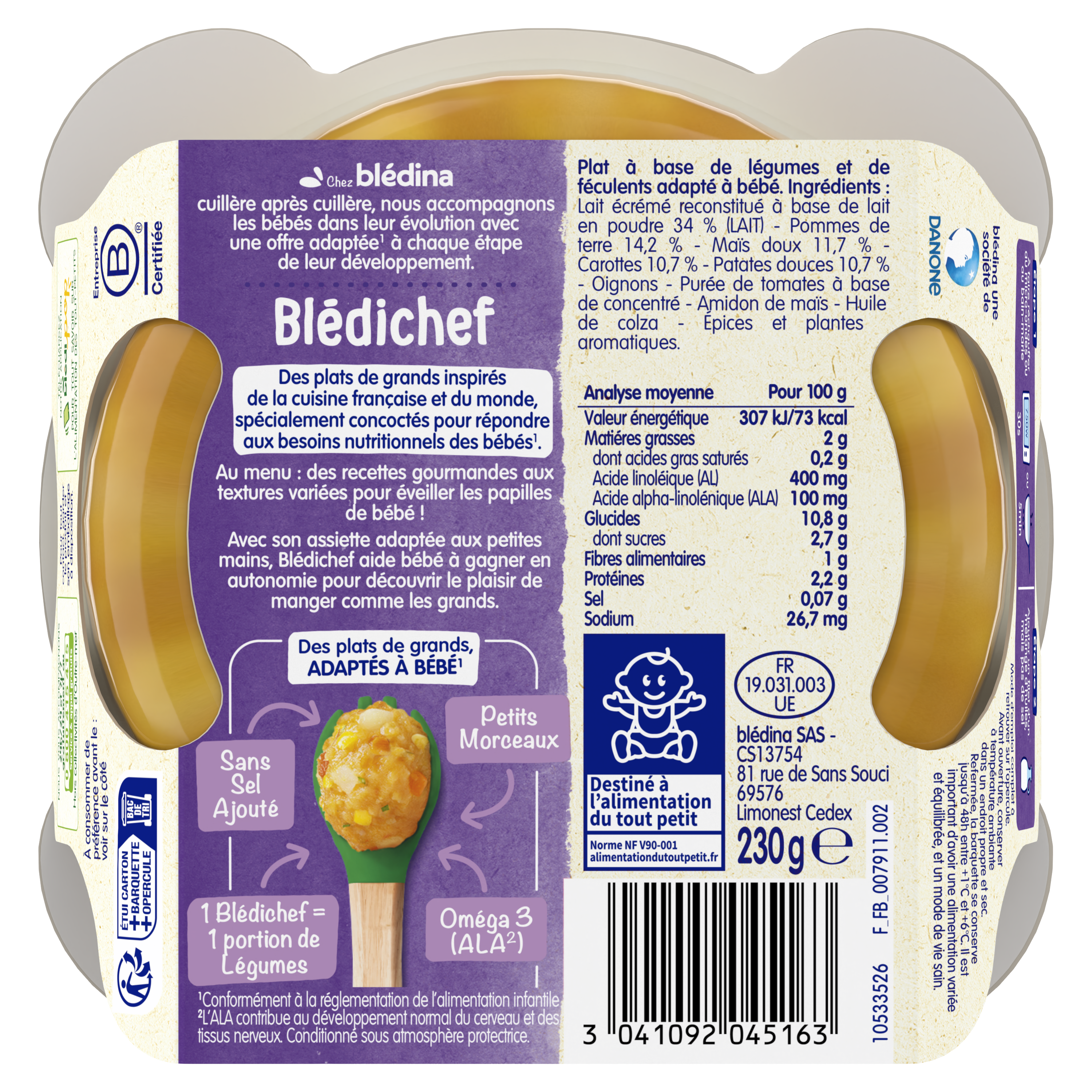 Découvrez les petits plats Blédichef® du soir de Blédina : une large gamme de plats savoureux pour le dîner, spécialement élaborés pour régaler votre bébé en toute sérénité et lui faire découvrir chaque jour de nouvelles saveurs ! ⠀⠀⠀⠀⠀⠀⠀⠀⠀ Ce petit plat du soir végétal et gourmand avec de la patate douce est adapté à bébé à partir de 12 mois ! Cette nouvelle recette spécialement élaborée avec des petits morceaux et des ingrédients 100% d'origine naturelle lui permettra de découvrir une nouvelle association de saveurs, sans sel ajouté ! ⠀⠀⠀⠀⠀⠀⠀⠀⠀