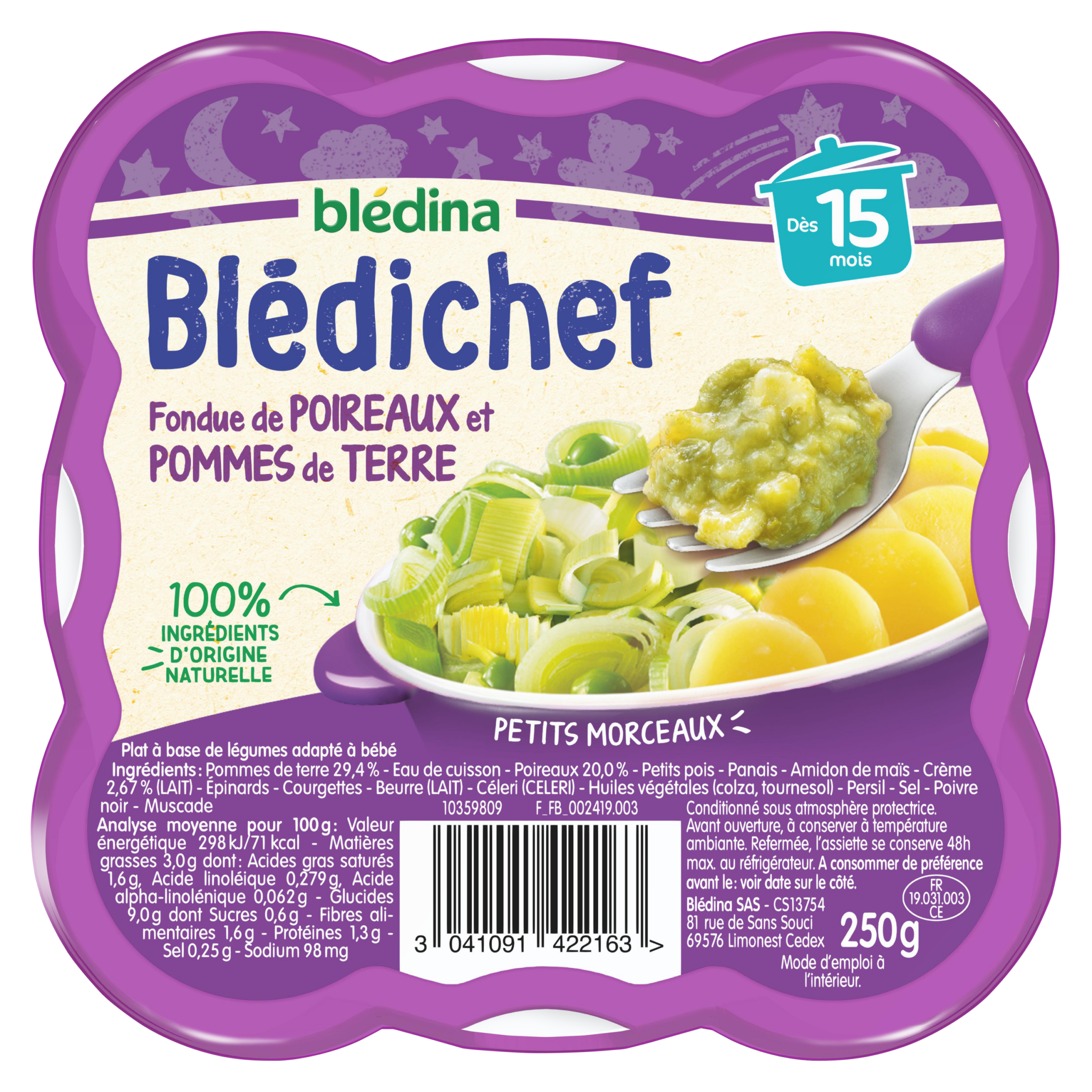 Découvrez les petits plats Blédichef® du soir de Blédina : une large gamme de plats savoureux pour le dîner, spécialement élaborés pour régaler votre bébé en toute sérénité et lui faire découvrir chaque jour de nouvelles saveurs ! Ce petit plat Blédichef®, avec des petits morceaux, est adapté à bébé à partir de 15 mois.   100% d’ingrédients d’origine naturelle