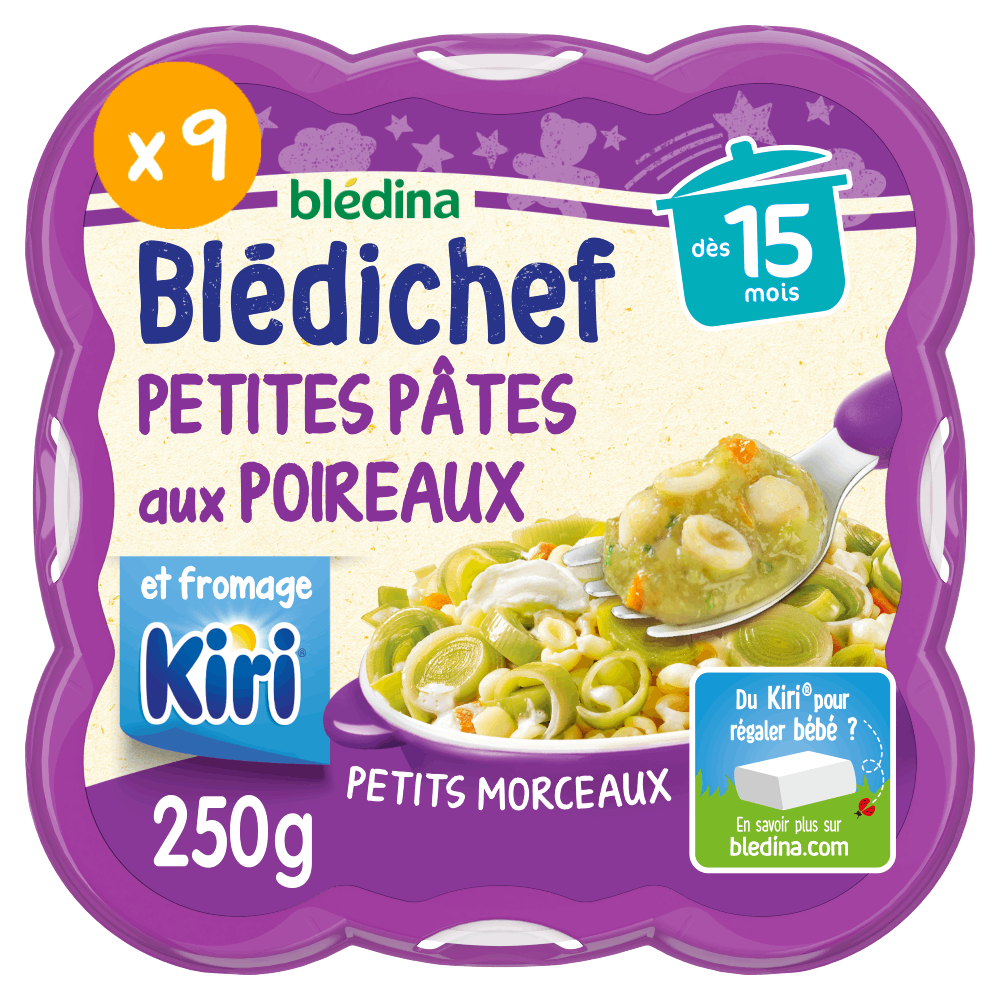 Découvrez ces petits plats Blédichef - Petites Pâtes aux Poireaux et fromage Kiri® dès 15 mois : de délicieuses pâtes fondantes accompagnées de poireaux, avec la douceur du fromage Kiri® qui plaira aux papilles de bébé ! Du fromage Kiri® pour régaler bébé ? Comme d'autres fromages, il est possible de proposer du fromage Kiri® Original* en quantité adaptée lors de la diversification alimentaire de bébé. Blédina a élaboré une gamme de plats du soir au fromage Kiri®, source de calcium, avec une faible teneur en sel et des petits morceaux adaptés.