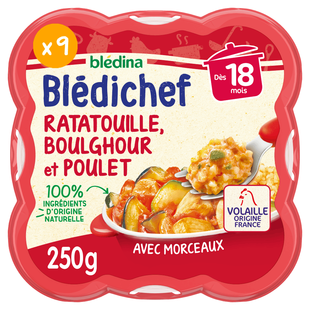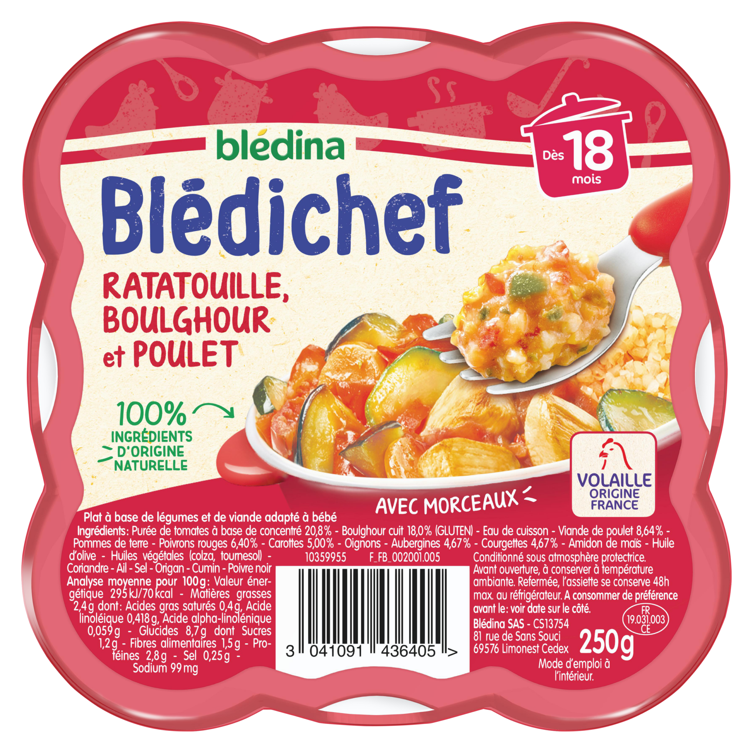 Ce petit plat Blédichef, avec des morceaux, est adapté à bébé à partir de 18 mois.