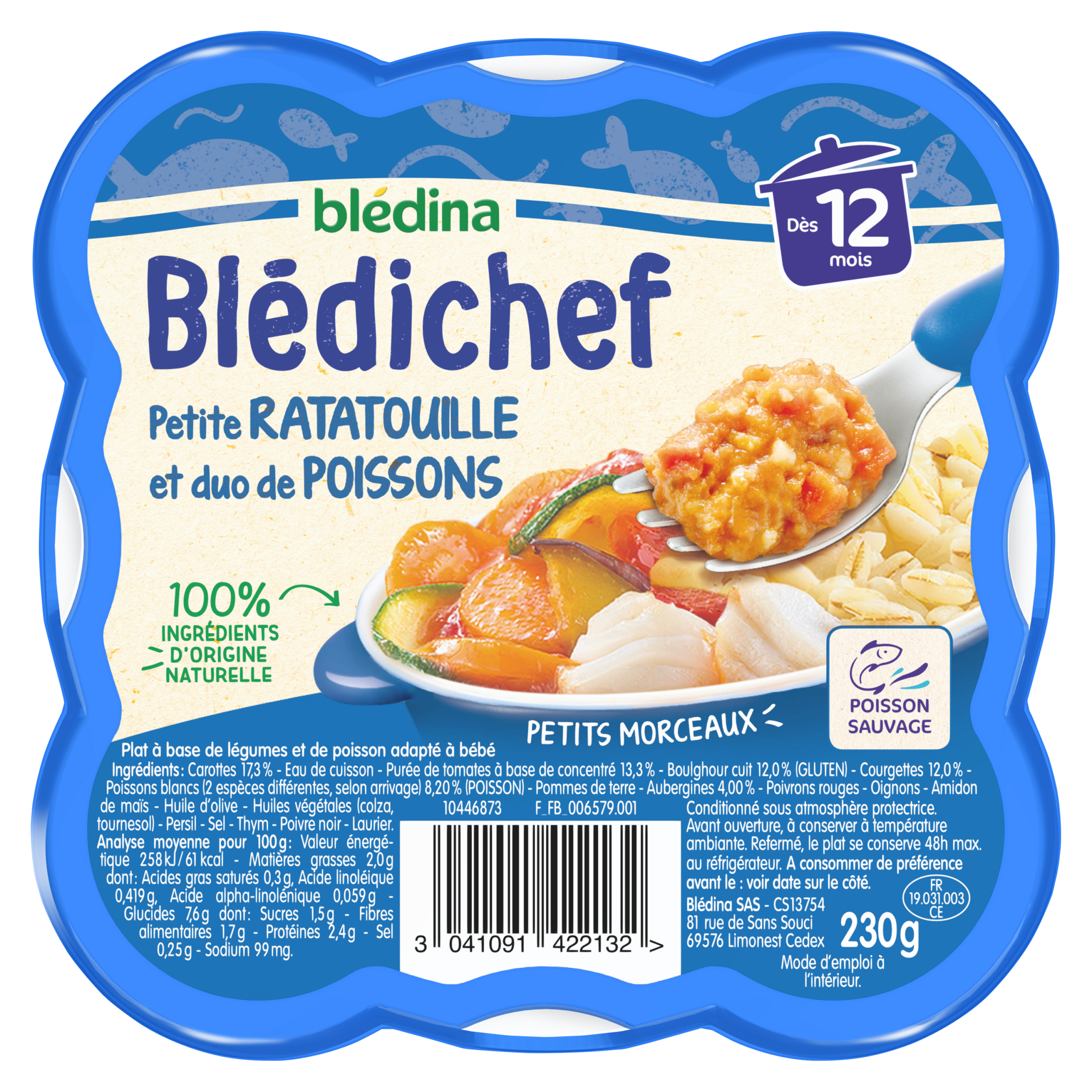 Découvrez les petits plats Blédichef® de Blédina : une large gamme de plats savoureux pour le déjeuner et le dîner, spécialement élaborés pour régaler votre bébé en toute sérénité et lui faire découvrir chaque jour de nouvelles saveurs ! Ce petit plat Blédichef®, avec des petits morceaux, est adapté à bébé à partir de 12 mois.   Des ingrédients d’origine naturelle