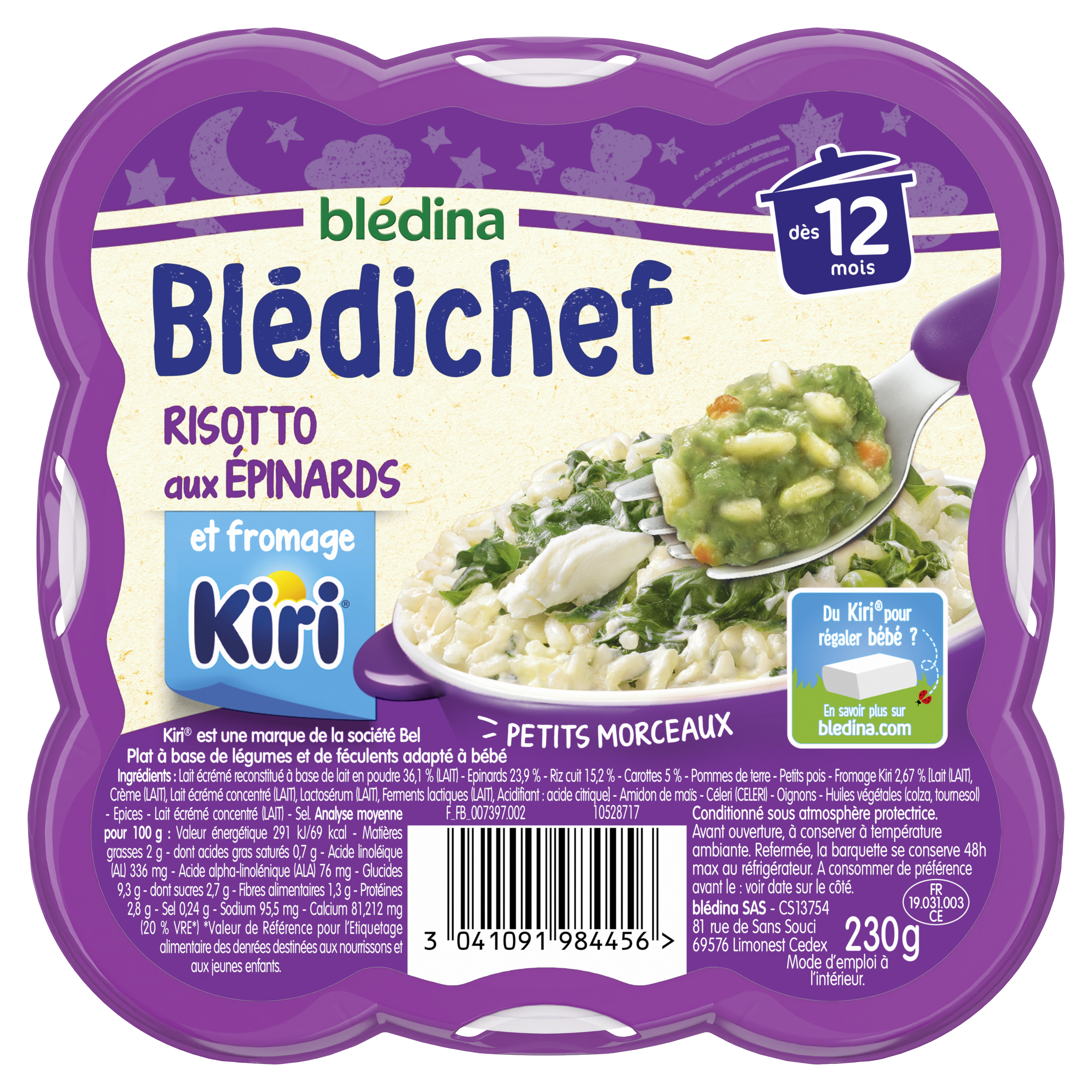 Découvrez ces petits plats Blédichef - Risotto aux Epinards et fromage Kiri® dès 12 mois : l'association des épinards avec la douceur du fromage Kiri® qui plaira aux papilles de bébé ! Du fromage Kiri® pour régaler bébé ? Comme d'autres fromages, il est possible de proposer du fromage Kiri® Original* en quantité adaptée lors de la diversification alimentaire de bébé. Blédina a élaboré une gamme de plats du soir au fromage Kiri®, source de calcium, avec une faible teneur en sel, des petits morceaux adaptés, et des ingrédients 100% d'origine naturelle.