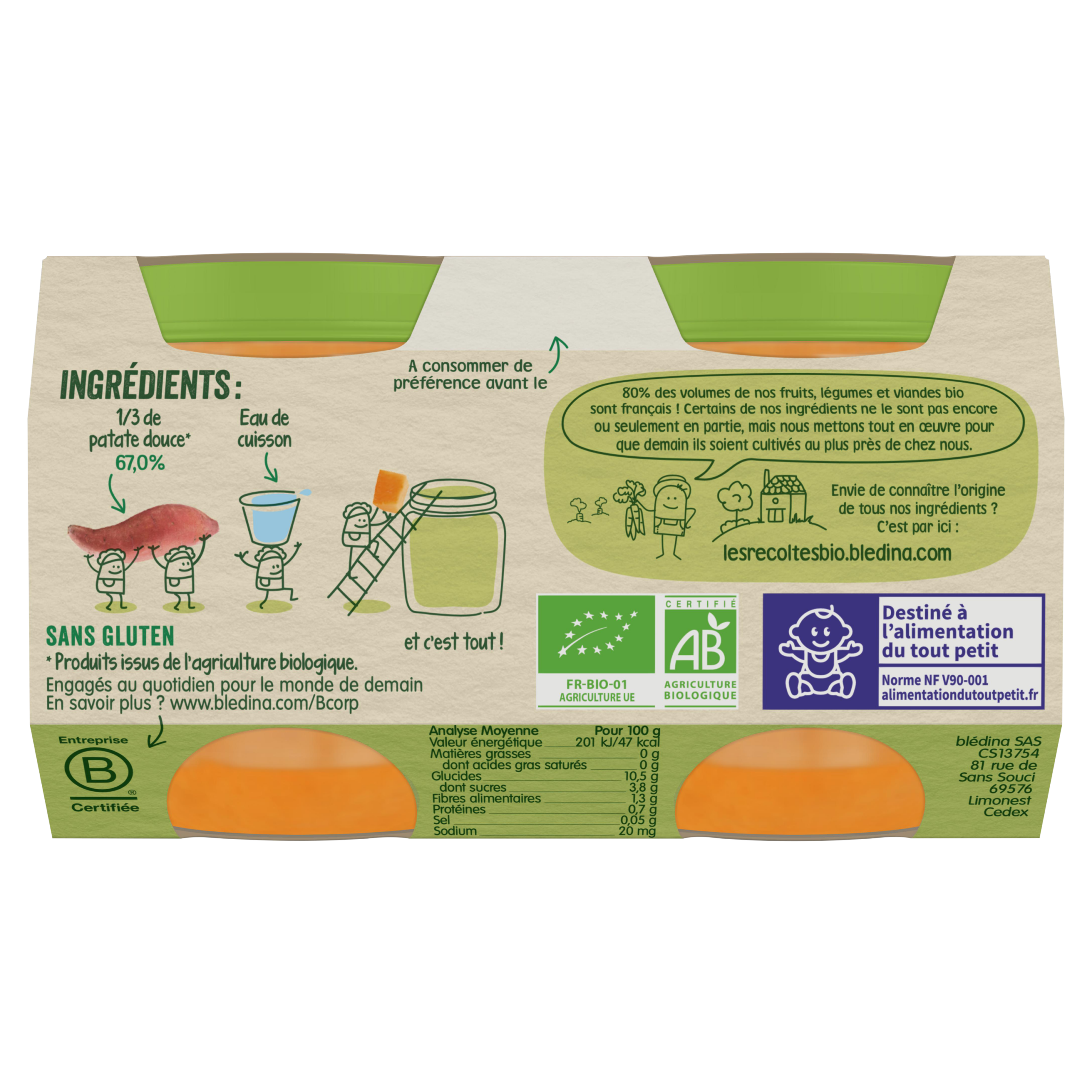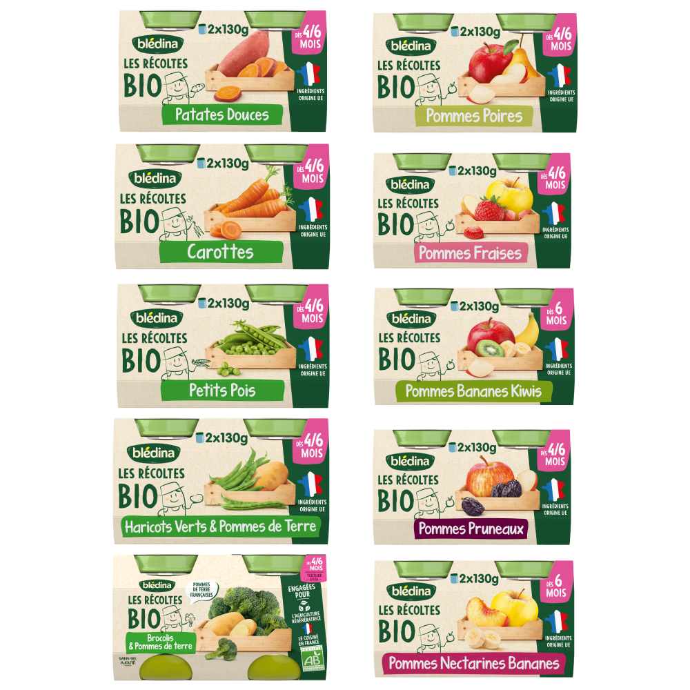 (Patates douces, Petit pot Carottes, Petit pot Petits pois, Petit pot Haricots Verts Pommes de Terre, Petit pot Brocolis Pommes de Terre)