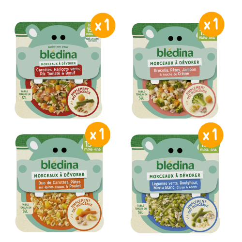 Découvrez les petits plats blédina MORCEAUX À DEVORER de 15 mois à 3 ans (se référer ci-dessous aux détails des informations du produit pour savoir si bébé est prêt). Un plat complet pour le midi composé d'ingrédients faciles à reconnaître pour apprendre à votre bébé à manger progressivement comme un grand. Aidez le à reconnaitre tous les bons ingrédients de son assiette ! ⠀⠀⠀⠀⠀⠀⠀⠀⠀ Ce lot contient 4 assiettes de 200g chacun de: 1x Morceaux à dévorer - Carottes, Haricots verts, Riz Tomaté & Bœuf 1x Morceaux à dévorer - Brocolis, Pâtes, Jambon & touche de Crème 1x Morceaux à dévorer - Duo de Carottes, Pâtes aux épices douces & Poulet 1x Morceaux à dévorer - Légumes verts, Boulghour, Merlu blanc, Citron & Aneth