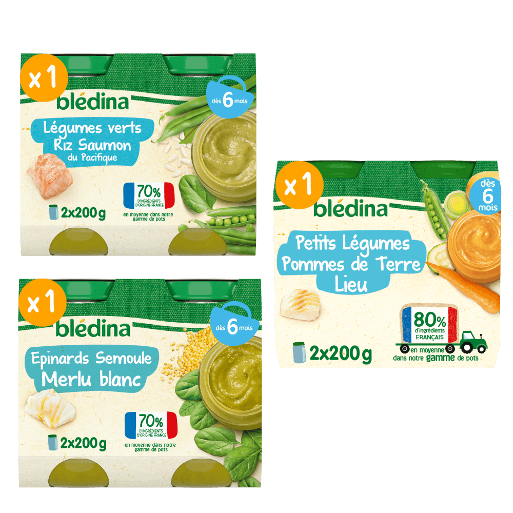 Découvrez nos Petits pots Blédina, de délicieuses recettes pour faire découvrir à bébé ses premiers légumes et ses premiers poissons. A déguster dès 6 mois.  ⠀⠀⠀⠀⠀⠀⠀⠀⠀ 70% de nos ingrédients sont français en moyenne dans notre gamme des pots Ces petits pots pour bébé pourront être proposés à votre tout-petit au moment du déjeuner ou du dîner ⠀⠀⠀⠀⠀⠀⠀⠀⠀ Ce lot contient 6 pots de 200g chacun. 2x Epinards Semoule Merlu Blanc 2x Légumes verts Riz Saumon du Pacifique  2x Petits Légumes Pommes de Terre Colin