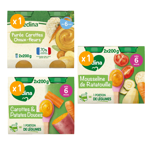 Découvrez nos Petits pots Blédina, de délicieuses recettes pour faire découvrir à bébé ses premiers légumes. A déguster dès 6 mois.  ⠀⠀⠀⠀⠀⠀⠀⠀⠀ 70% de nos ingrédients sont français en moyenne dans notre gamme des pots Ces petits pots pour bébé pourront être proposés à votre tout-petit au moment du déjeuner ou du dîner ⠀⠀⠀⠀⠀⠀⠀⠀⠀ Ce lot multi-variétés contient 6 packs de 2x200g chacun. 2x Carottes patates douces (2x200g) 2x Mousseline de ratatouille (2x200g) 2x Purée Carottes Choux-Fleurs (2x200g)