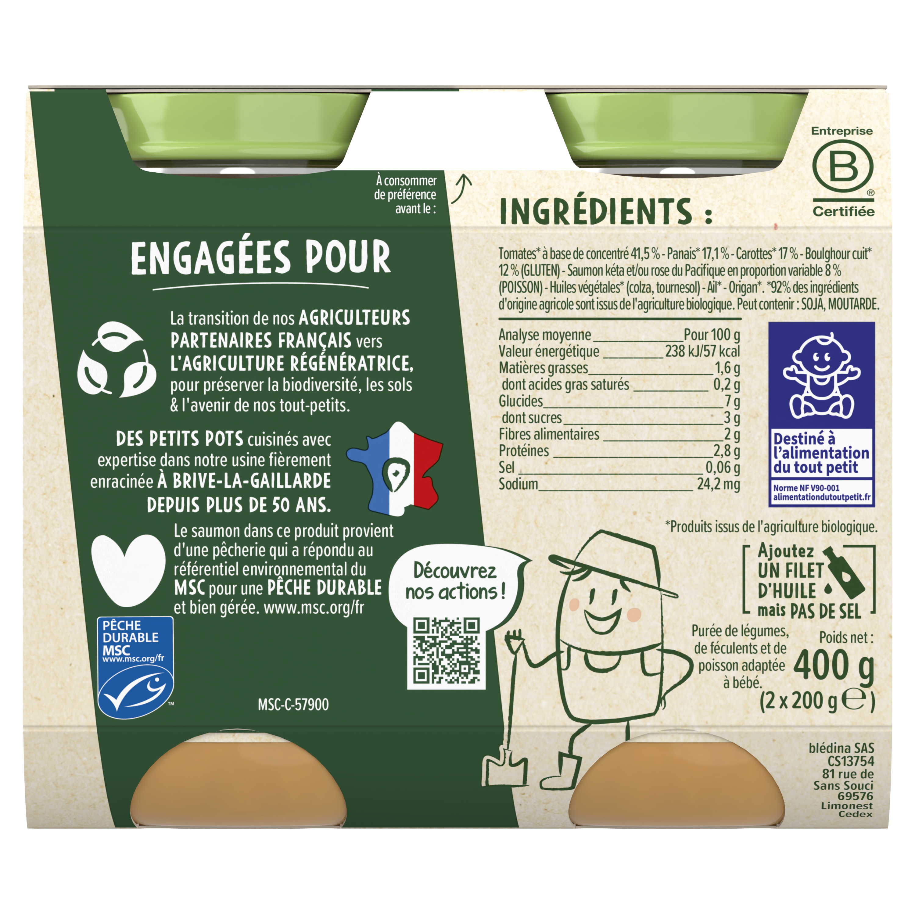 Découvrez nos Petits pots Les récoltes Bio et Engagées, de délicieuses recettes aux légumes accompagnées de viande ou de poisson avec des petits morceaux adaptées aux bébés dès 8 mois. Les Récoltes Engagées : composées d'ingrédients des recettes mitonnées avec du poisson sauvage péché en pleine mer* et issu de la pêche durable, selon le référentiel MSC. C'est pourquoi il ne peut être certifié bio. Comme nos Récoltes Bio, les légumes de ces recettes engagées sont issus de l'Agriculture biologique. * Ce produit est conforme au référentiel mondial du MSC pour la pêche durable. Ce lot contient 6 pots de 200g chacun: 2x Les récoltes Bio - Petits pots Panais Potimarron Dinde petits morceaux 2x Les récoltes Bio - Petits pots - Ecrasé de Carottes Haricots verts Bœuf 2x Les récoltes Bio - Petits pots - Tomates Boulghour et Saumon sauvage