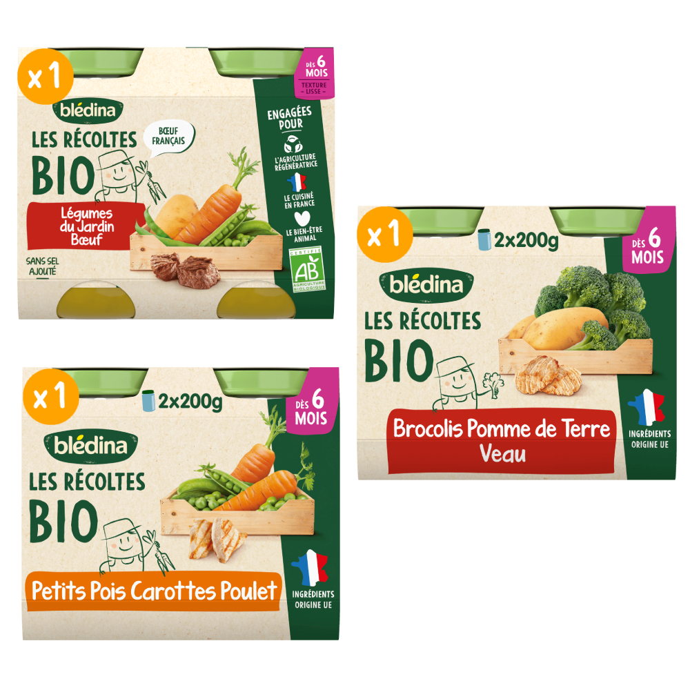 Découvrez nos Petits pots Les récoltes Bio, de délicieuses purées pour faire découvrir à bébé ses premières recettes de légumes et de viande. A déguster dès 6 mois.  ⠀⠀⠀⠀⠀⠀ Ce lot contient 6 pots de 200g chacun:  2x Les récoltes Bio - Légumes du Jardin & Bœuf  2x Les récoltes Bio - Carottes, Petits Pois et Poulet 2 x Les récoltes Bio - Brocolis, Pommes de Terre & Veau