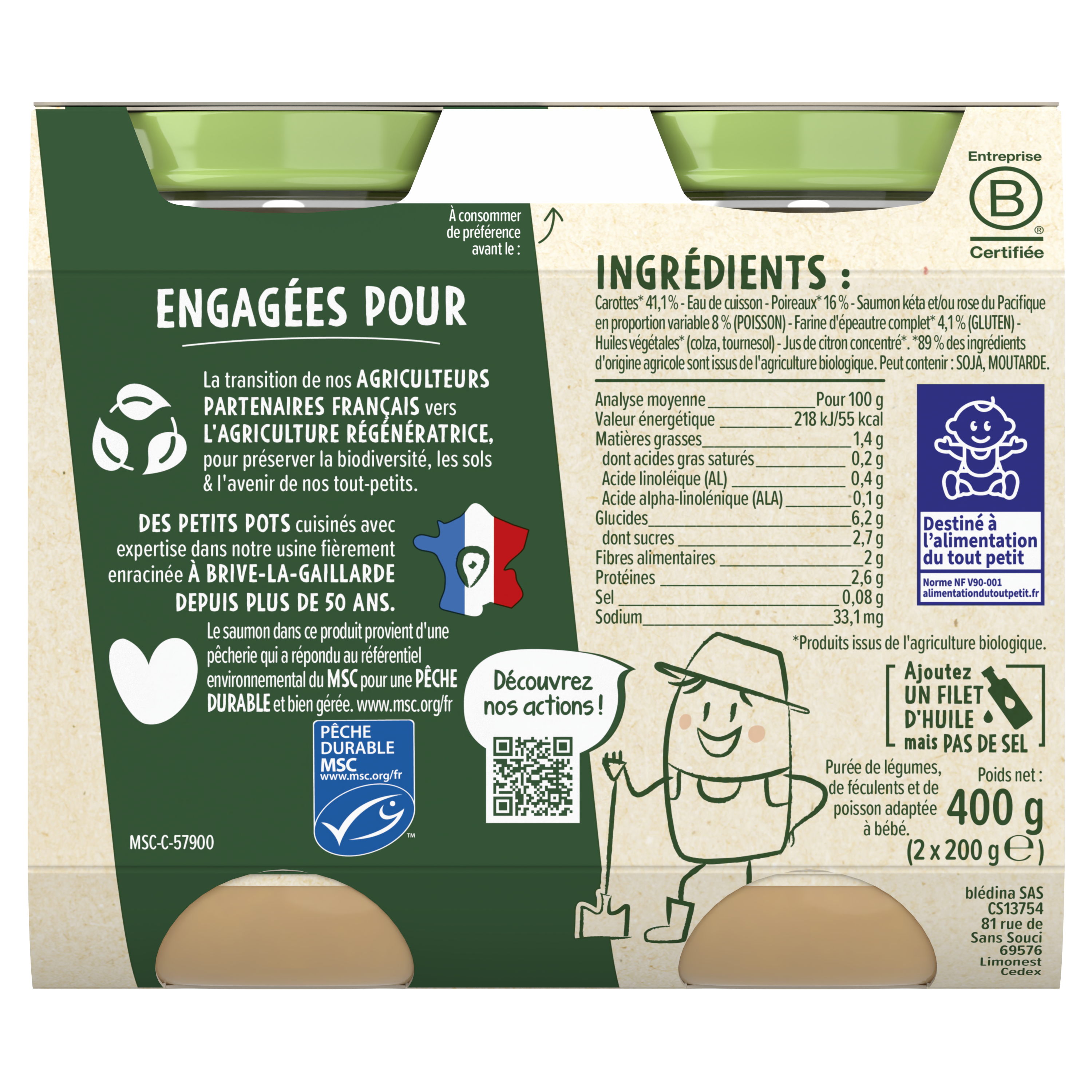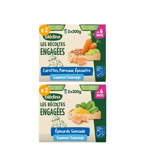 Découvrez nos Petits pots Les récoltes Engagées, pour faire découvrir à bébé le bon goût du Saumon sauvage accompagné de délicieux légumes. A déguster dès 6 mois. Les Récoltes Engagées : composées d'ingrédients des recettes mitonnées avec du poisson sauvage péché en pleine mer* et issu de la pêche durable, selon le référentiel MSC. C'est pourquoi il ne peut être certifié bio. Comme nos Récoltes Bio, les légumes de ces recettes engagées sont issus de l'Agriculture biologique.